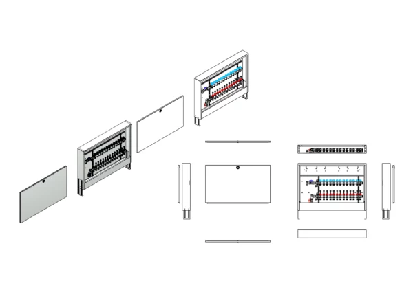 Anschlussstation für Flächenheizungen im Aufputzschrank: Diese Station enthält einen Edelstahlverteiler mit absperrbaren Durchflussanzeigern und Ventileinsätzen für EGO-Schnellverschluss. Die vertikale Anschlussgarnitur kommt ohne Wärmezählerverrohrung, bietet jedoch Platz für eine Klemmleiste und EGO-Regelantriebe.