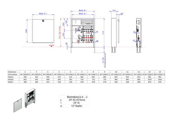 strawa Comfort Anschlussstation FBH-63-V-CA-E 9 Hkr.,BxHxT: 732 x 710 x 125 mm, vert. AG. o. WMZ, Verteiler mit DFA 0-3 l/min + THV M30x1,5, vorm. Stellantr. + Klemml. m. Vorverdraht., Comfort-AP-Schrank in RAL 9016