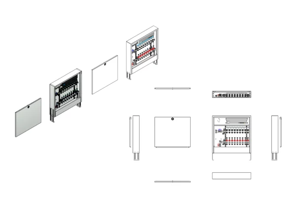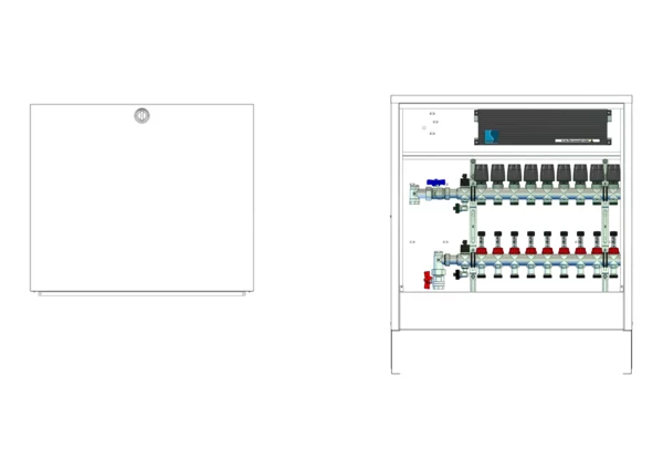 Anschlussstation für Flächenheizung, im Aufputzschrank montierter Edelstahlverteiler mit regulierbaren Durchflussanzeigern und Ventileinsätzen (M30x1,5), vertikale Anschlussgarnitur ohne Wärmezählerverrohrung, vormontierte und verdrahtete Stellantriebe auf montierter Klemmleiste.