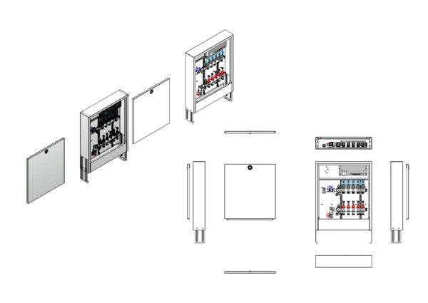 Anschlussstation für Flächenheizung, im Aufputzschrank montierter Edelstahlverteiler mit absperrbarem Durchflussanzeigern und Ventileinsätzen für EGO-Schnellverschluss, vertikale Anschlussgarnitur ohne Wärmezählerverrohrung, vormontierte und vorverdrahtete EGO-Regelantriebe auf vormontierter Klemmleiste.