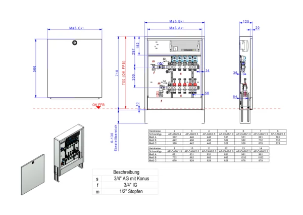 strawa Comfort Anschlussstation FBH-18-V-CA-EGO 7 Hkr.,BxHxT: 732 x 710 x 125 mm, vert. AG. o. WMZ, Verteiler mit DFA min/max + THV für EGO, m. vorm. EGO-Regelantr. u. Klemml. mit Vorverdr., Comfort-AP-Schrank in RAL 9016