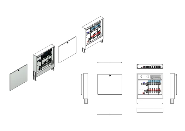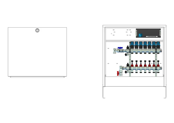 Anschlussstation für Flächenheizung, im Aufputzschrank montierter Edelstahlverteiler mit absperrbarem Durchflussanzeigern und Ventileinsätzen für EGO-Schnellverschluss, vertikale Anschlussgarnitur ohne Wärmezählerverrohrung, vormontierte und vorverdrahtete EGO-Regelantriebe auf vormontierter Klemmleiste.