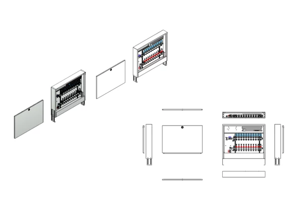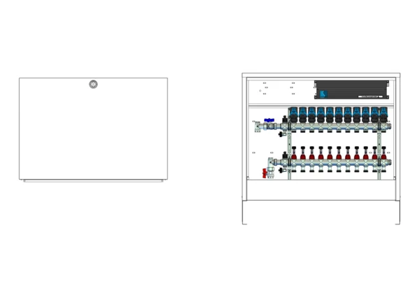 Anschlussstation für Flächenheizung, im Aufputzschrank montierter Edelstahlverteiler mit absperrbarem Durchflussanzeigern und Ventileinsätzen für EGO-Schnellverschluss, vertikale Anschlussgarnitur ohne Wärmezählerverrohrung, vormontierte und vorverdrahtete EGO-Regelantriebe auf vormontierter Klemmleiste.