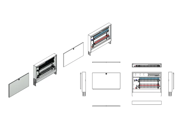 vertikale Anschlussgarnitur ohne Wärmezählerverrohrung, Verteiler mit Durchflussanzeiger min/max im Vorlaufbalken und Thermostatventileinsatz für EGO-Aufnahme im Rücklaufbalken, mit vormontierten EGO-Regelantrieben und Klemmleiste mit Vorverdrahtung, Comfort-Aufputz-Schrank in RAL 9016