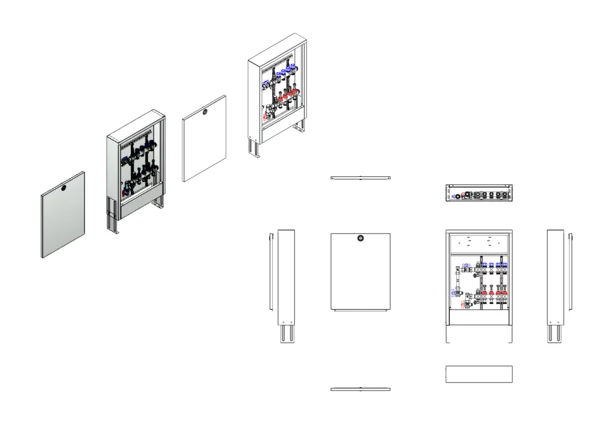 Anschlussstation für Flächenheizung und -kühlung, im Aufputzschrank montierter Edelstahlverteiler mit regulierbaren Durchflussanzeigern und Ventileinsätzen (M30x1,5), vertikale Anschlussgarnitur mit Wärmezählerverrohrung, Platzhaltung für Klemmleiste und Stellantriebe.