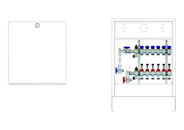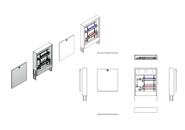 Anschlussstation für Flächenheizung und -kühlung, im Aufputzschrank montierter Edelstahlverteiler mit regulierbaren Durchflussanzeigern und Ventileinsätzen (M30x1,5), vertikale Anschlussgarnitur mit Wärmezählerverrohrung, Platzhaltung für Klemmleiste und Stellantriebe.