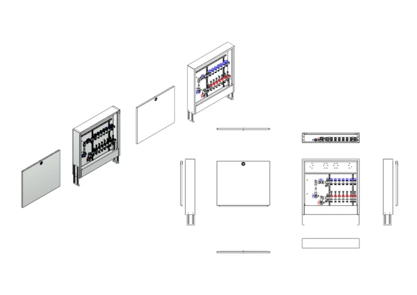 Anschlussstation für Flächenheizung und -kühlung, im Aufputzschrank montierter Edelstahlverteiler mit regulierbaren Durchflussanzeigern und Ventileinsätzen (M30x1,5), vertikale Anschlussgarnitur mit Wärmezählerverrohrung, Platzhaltung für Klemmleiste und Stellantriebe.