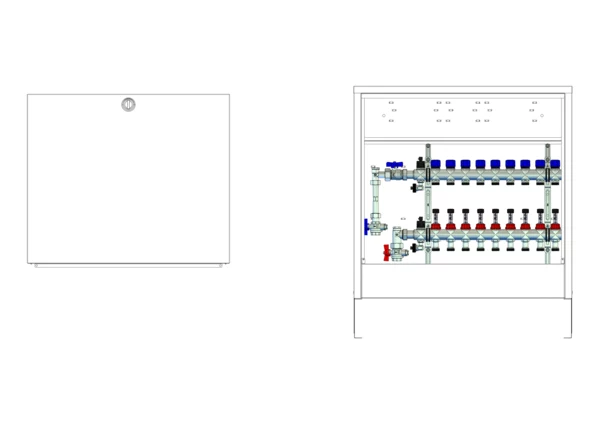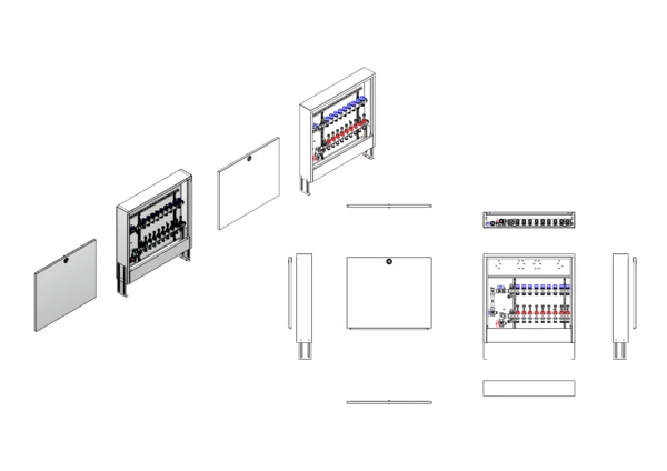 Anschlussstation für Flächenheizung und -kühlung, im Aufputzschrank montierter Edelstahlverteiler mit regulierbaren Durchflussanzeigern und Ventileinsätzen (M30x1,5), vertikale Anschlussgarnitur mit Wärmezählerverrohrung, Platzhaltung für Klemmleiste und Stellantriebe.