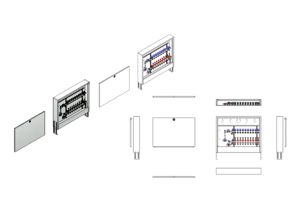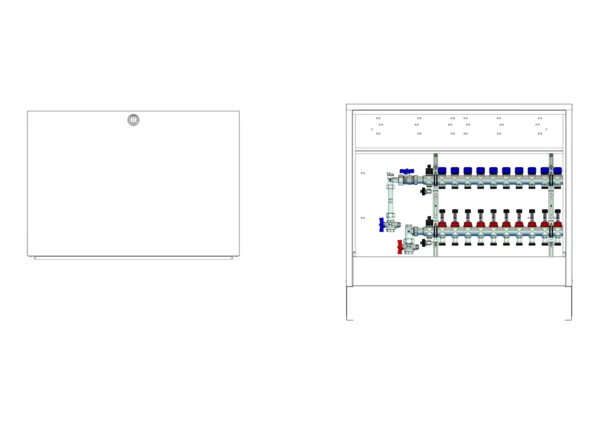 Anschlussstation für Flächenheizung und -kühlung, im Aufputzschrank montierter Edelstahlverteiler mit regulierbaren Durchflussanzeigern und Ventileinsätzen (M30x1,5), vertikale Anschlussgarnitur mit Wärmezählerverrohrung, Platzhaltung für Klemmleiste und Stellantriebe.