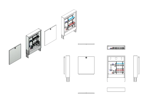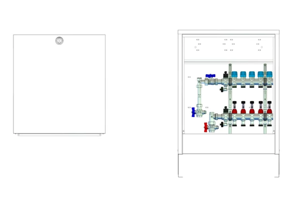 Anschlussstation für Flächenheizung und -kühlung, im Aufputzschrank montierter Edelstahlverteiler mit absperrbarem Durchflussanzeigern und Ventileinsätzen für EGO-Schnellverschluss, vertikale Anschlussgarnitur mit Wärmezählerverrohrung, Platzhaltung für Klemmleiste und EGO-Regelantriebe.