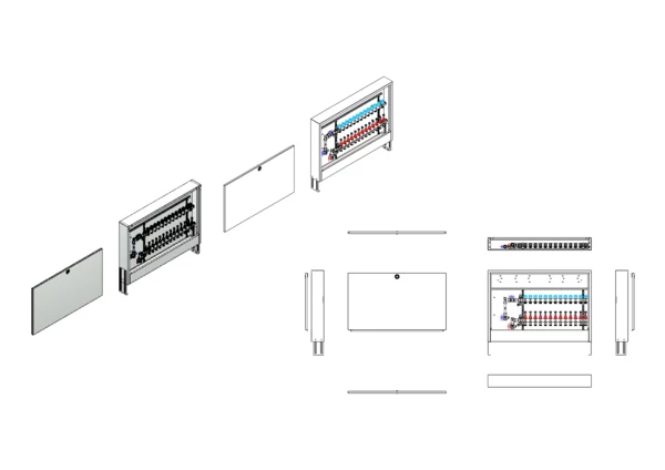 Anschlussstation für Flächenheizung und -kühlung, im Aufputzschrank montierter Edelstahlverteiler mit absperrbarem Durchflussanzeigern und Ventileinsätzen für EGO-Schnellverschluss, vertikale Anschlussgarnitur mit Wärmezählerverrohrung, Platzhaltung für Klemmleiste und EGO-Regelantriebe.