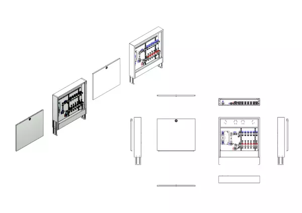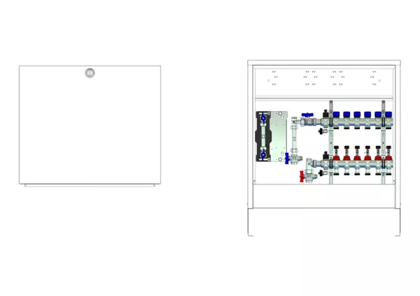 Anschlussstation für Flächenheizung und -kühlung, im Aufputzschrank montierter Edelstahlverteiler mit regulierbaren Durchflussanzeigern und Ventileinsätzen (M30x1,5), vertikale Anschlussgarnitur mit Wärmezählerverrohrung, Wasserzählereinbaustrecke für Trinkwasser kalt, Platzhaltung für Klemmleiste und Stellantriebe