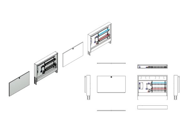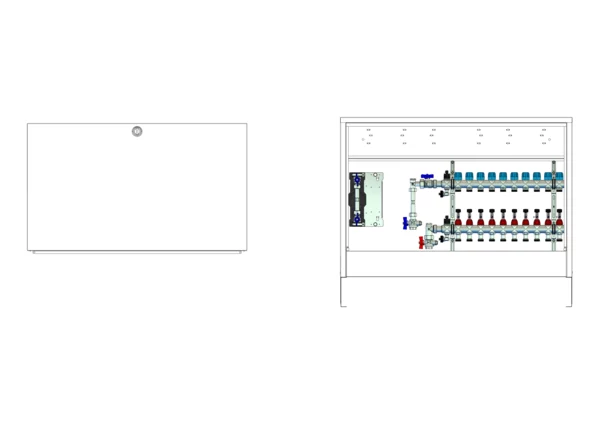 Anschlussstation für Flächenheizung und -kühlung, im Aufputzschrank montierter Edelstahlverteiler mit absperrbarem Durchflussanzeigern und Ventileinsätzen für EGO-Schnellverschluss, vertikale Anschlussgarnitur mit Wärmezählerverrohrung, Wasserzählereinbaustrecke für Trinkwasser kalt, Platzhaltung für Klemmleiste und EGO-Regelantriebe.