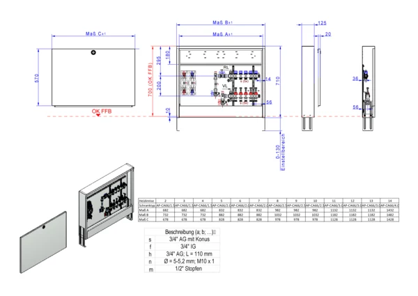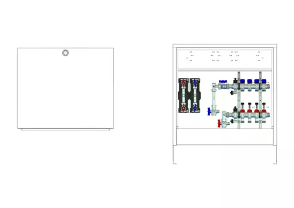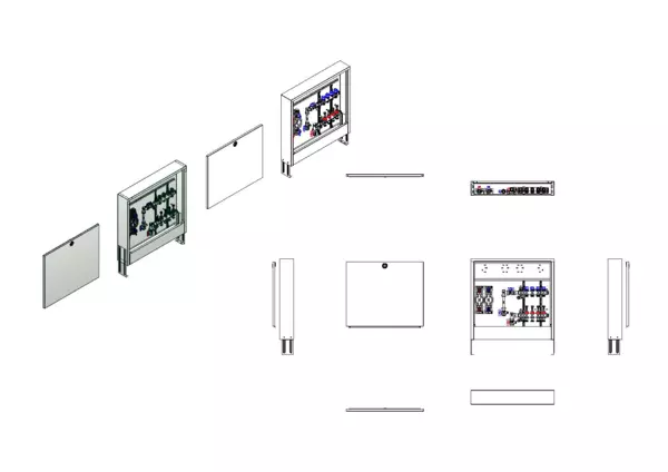 Anschlussstation für Flächenheizung und -kühlung, im Aufputzschrank montierter Edelstahlverteiler mit regulierbaren Durchflussanzeigern und Ventileinsätzen (M30x1,5), vertikale Anschlussgarnitur mit Wärmezählerverrohrung, Wasserzählereinbaustrecke für Trinkwasser kalt und warm, Platzhaltung für Klemmleiste und Stellantriebe
