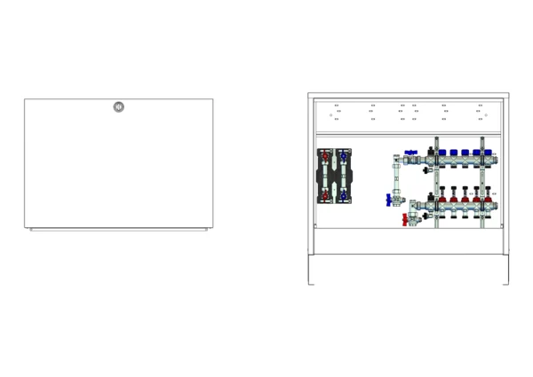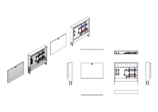 Anschlussstation für Flächenheizung und -kühlung, im Aufputzschrank montierter Edelstahlverteiler mit regulierbaren Durchflussanzeigern und Ventileinsätzen (M30x1,5), vertikale Anschlussgarnitur mit Wärmezählerverrohrung, Wasserzählereinbaustrecke für Trinkwasser kalt und warm, Platzhaltung für Klemmleiste und Stellantriebe