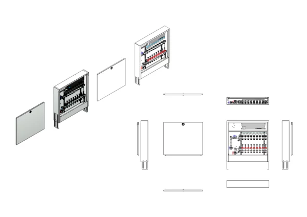 Anschlussstation für Flächenheizung, im Aufputzschrank montierter Edelstahlverteiler mit regulierbaren Durchflussanzeigern und Ventileinsätzen (M30x1,5), vertikale Anschlussgarnitur mit Wärmezählerverrohrung, vormontierte und verdrahtete Stellantriebe auf montierter Klemmleiste.