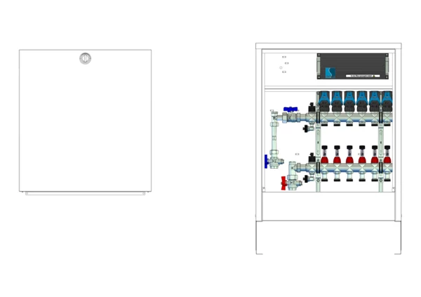 strawa Comfort Anschlussstation FBH-18-V-WMZ-CA-EGO 6 Hkr.,BxHxT: 582x710x125 mm, vert. AG. m. WMZ, Verteiler mit DFA min/max + THV für EGO, m. vorm. EGO-Regelantr. u. Klemml. mit Vorverdr., Comfort-AP-Schrank in RAL 9016