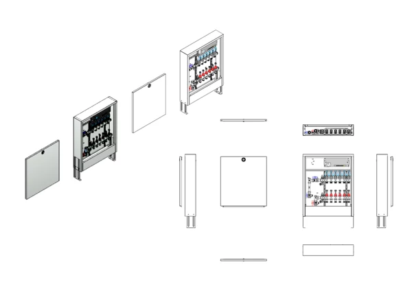 Anschlussstation für Flächenheizung, im Aufputzschrank montierter Edelstahlverteiler mit absperrbarem Durchflussanzeigern und Ventileinsätzen für EGO-Schnellverschluss, vertikale Anschlussgarnitur mit Wärmezählerverrohrung, vormontierte und vorverdrahtete EGO-Regelantriebe auf vormontierter Klemmleiste.