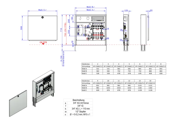 Anschlussstation für Flächenheizung, im Aufputzschrank montierter Edelstahlverteiler mit regulierbaren Durchflussanzeigern und Ventileinsätzen (M30x1,5), vertikale Anschlussgarnitur mit Wärmezählerverrohrung, Wasserzählereinbaustrecke für Trinkwasser kalt,