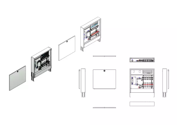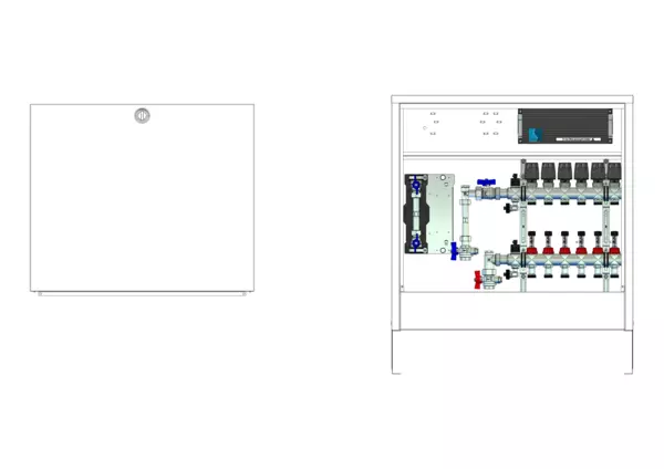 Anschlussstation für Flächenheizung, im Aufputz-Schrank montierter Edelstahlverteiler mit regulierbaren Durchflussanzeigern und Ventileinsätzen (M30×1,5), vertikale Anschlussgarnitur mit Wärmezählerverrohrung, Wasserzählereinbaustrecke für Trinkwasser kalt, vormontierte und verdrahtete Stellantriebe auf montierter Klemmleiste