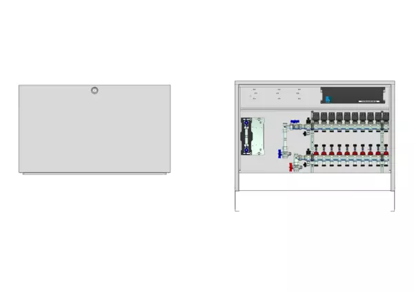 strawa Comfort Anschlussstation FBH-63-V-W1-WMZ-CA-E 10 Hkr.,BxHxT: 1032x712x125 mm, vert. AG. m. WMZ, Verteiler mit DFA 0-3 l/min + THV M30x1,5, vorm. Stellantr. + Klemml. m. Vorverdraht., Wasserzählerstr. TW kalt, Comfort-AP-Schrank in RAL 9016