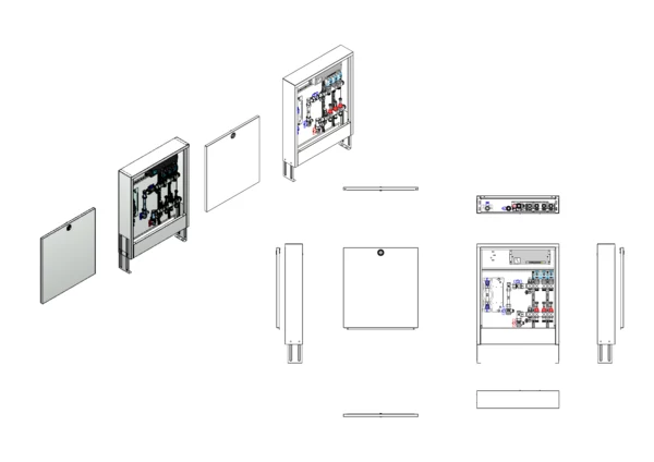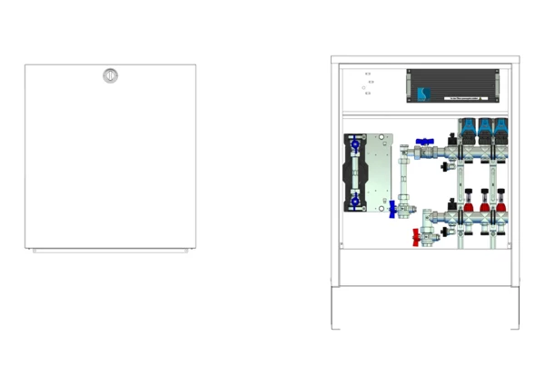 Anschlussstation für Flächenheizung, im Aufputzschrank montierter Edelstahlverteiler mit absperrbarem Durchflussanzeigern und Ventileinsätzen für EGO-Schnellverschluss, vertikale Anschlussgarnitur mit Wärmezählerverrohrung, Wasserzählereinbaustrecke für Trinkwasser kalt, vormontierte und vorverdrahtete EGO-Regelantriebe auf vormontierter Klemmleiste.