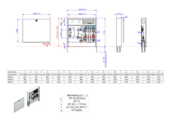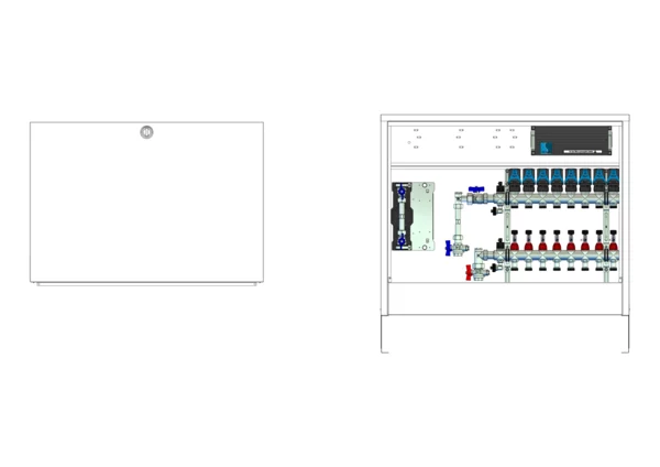 Anschlussstation für Flächenheizung, im Aufputzschrank montierter Edelstahlverteiler mit absperrbarem Durchflussanzeigern und Ventileinsätzen für EGO-Schnellverschluss, vertikale Anschlussgarnitur mit Wärmezählerverrohrung, Wasserzählereinbaustrecke für Trinkwasser kalt, vormontierte und vorverdrahtete EGO-Regelantriebe auf vormontierter Klemmleiste.