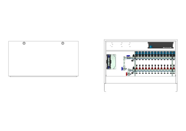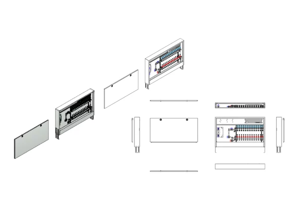 Anschlussstation für Flächenheizung, im Aufputzschrank montierter Edelstahlverteiler mit absperrbarem Durchflussanzeigern und Ventileinsätzen für EGO-Schnellverschluss, vertikale Anschlussgarnitur mit Wärmezählerverrohrung, Wasserzählereinbaustrecke für Trinkwasser kalt, vormontierte und vorverdrahtete EGO-Regelantriebe auf vormontierter Klemmleiste.