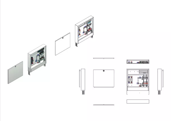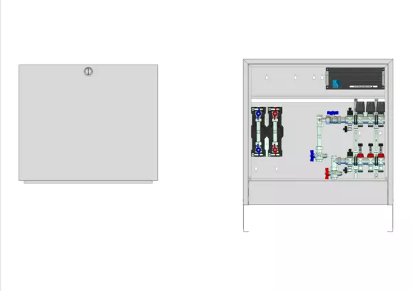 strawa Comfort Anschlussstation FBH-63-V-W2-WMZ-CA-E 3 Hkr.,BxHxT: 732x710x125 mm, vert. AG. m. WMZ, Verteiler mit DFA 0-3 l/min + THV M30x1,5, vorm. Stellantr. + Klemml. m. Vorverdraht., Wasserzählerstr. TW kalt, Comfort-AP-Schrank in RAL 9016