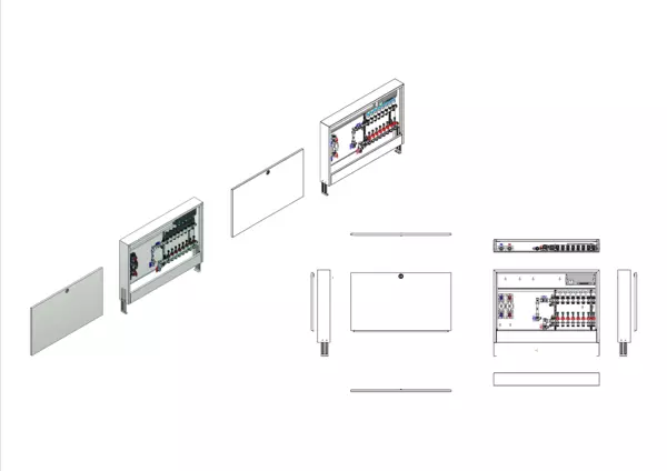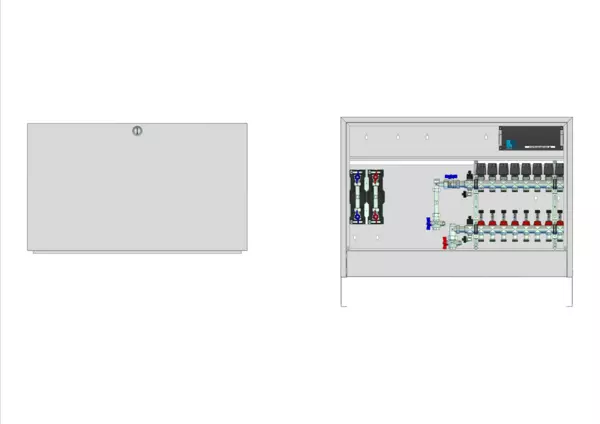 Anschlussstation für Flächenheizung, im Aufputzschrank montierter Edelstahlverteiler mit regulierbaren Durchflussanzeigern und Ventileinsätzen (M30x1,5), vertikale Anschlussgarnitur mit Wärmezählerverrohrung, Wasserzählereinbaustrecke für Trinkwasser kalt und warm, vormontierte und vorverdrahtete Stellantriebe auf vormontierter Klemmleiste