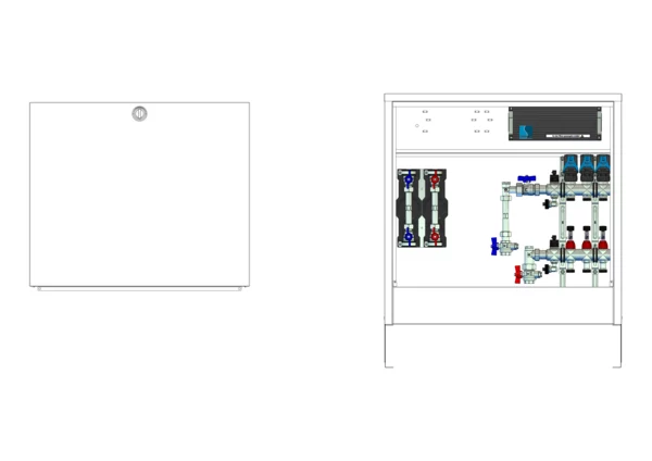 strawa Comfort Anschlussstation FBH-18-V-W2-WMZ-CA-EGO 3 Hkr.,BxHxT: 732x710x125 mm, vert. AG. m. WMZ, Verteiler m. DFA min/max+THV für EGO, m. vorm. EGO-Regelantr. u. Klemml. m. Vorverdr., Wasserzählerstr. TW kalt u. warm, Comfort-AP-Schrank RAL 9016