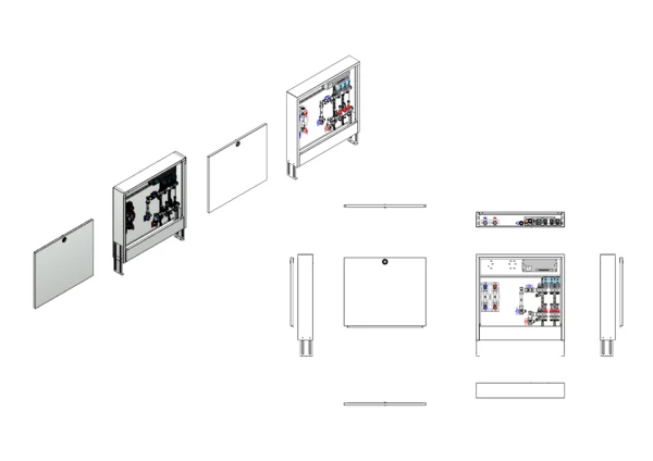 Anschlussstation für Flächenheizung, im Aufputzschrank montierter Edelstahlverteiler mit absperrbarem Durchflussanzeigern und Ventileinsätzen für EGO-Schnellverschluss, vertikale Anschlussgarnitur mit Wärmezählerverrohrung, Wasserzählereinbaustrecke für Trinkwasser kalt und warm, vormontierte und vorverdrahtete EGO-Regelantriebe auf vormontierter Klemmleiste.