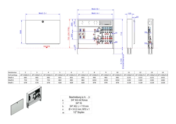 strawa Comfort Anschlussstation FBH-18-V-W2-WMZ-CA-EGO 7 Hkr.,BxHxT: 882 x 710 x 125 mm, vert. AG. m. WMZ, Verteiler m. DFA min/max+THV für EGO, m. vorm. EGO-Regelantr. u. Klemml. m. Vorverdr., Wasserzählerstr. TW kalt u. warm, Comfort-AP-Schrank RAL 9016