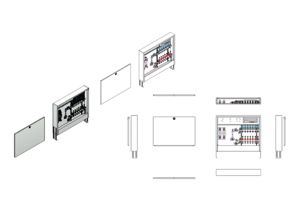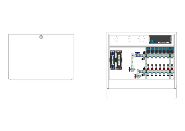 Anschlussstation für Flächenheizung, im Aufputzschrank montierter Edelstahlverteiler mit absperrbarem Durchflussanzeigern und Ventileinsätzen für EGO-Schnellverschluss, vertikale Anschlussgarnitur mit Wärmezählerverrohrung, Wasserzählereinbaustrecke für Trinkwasser kalt und warm, vormontierte und vorverdrahtete EGO-Regelantriebe auf vormontierter Klemmleiste.
