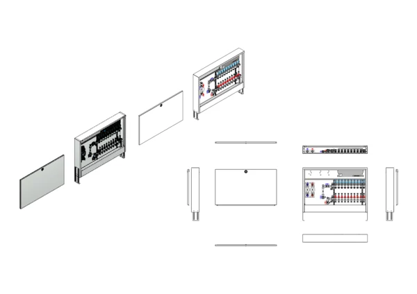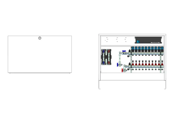 Anschlussstation für Flächenheizung, im Aufputzschrank montierter Edelstahlverteiler mit absperrbarem Durchflussanzeigern und Ventileinsätzen für EGO-Schnellverschluss, vertikale Anschlussgarnitur mit Wärmezählerverrohrung, Wasserzählereinbaustrecke für Trinkwasser kalt und warm, vormontierte und vorverdrahtete EGO-Regelantriebe auf vormontierter Klemmleiste.