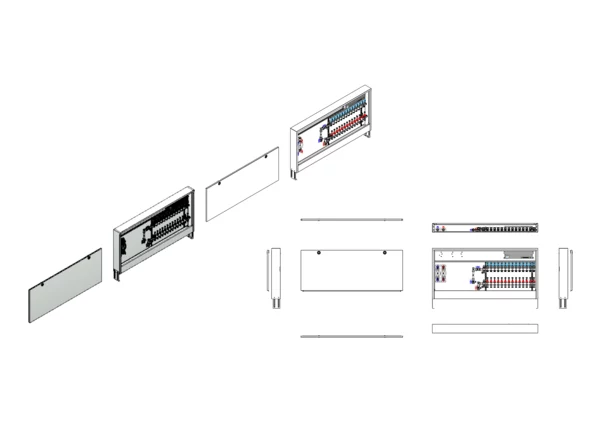 Anschlussstation für Flächenheizung, im Aufputzschrank montierter Edelstahlverteiler mit absperrbarem Durchflussanzeigern und Ventileinsätzen für EGO-Schnellverschluss, vertikale Anschlussgarnitur mit Wärmezählerverrohrung, Wasserzählereinbaustrecke für Trinkwasser kalt und warm, vormontierte und vorverdrahtete EGO-Regelantriebe auf vormontierter Klemmleiste.