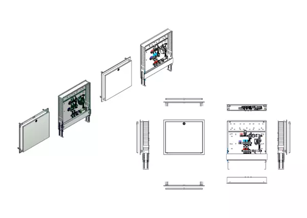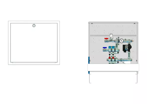 Die Regelstation für Flächenheizung ist mit einer Festwertregelung 20-50 °C ausgestattet. Die im Unterputzschrank montierte Regelgruppe umfasst eine Umwälzpumpe, einen Edelstahlverteiler mit absperrbaren Durchflussanzeigern und Ventileinsätzen für EGO-Schnellverschluss, sowie eine horizontale Anschlussgarnitur ohne Wärmezählerverrohrung. Es gibt Platzhaltungen für eine Klemmleiste und EGO-Regelantriebe.