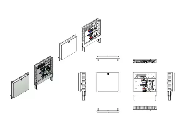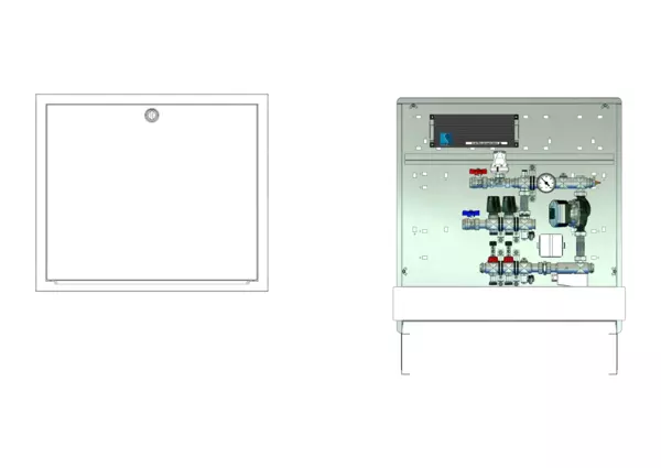 Die Regelstation für Flächenheizung ist mit einer Festwertregelung 20-50 °C ausgestattet. Die im Unterputzschrank montierte Regelgruppe umfasst eine Umwälzpumpe, einen Edelstahlverteiler mit regulierbaren Durchflussanzeigern und Ventileinsätzen (M30x1,5), sowie eine horizontale Anschlussgarnitur ohne Wärmezählerverrohrung. Die vormontierten und verdrahteten Stellantriebe sind auf einer montierten Klemmleiste installiert.
