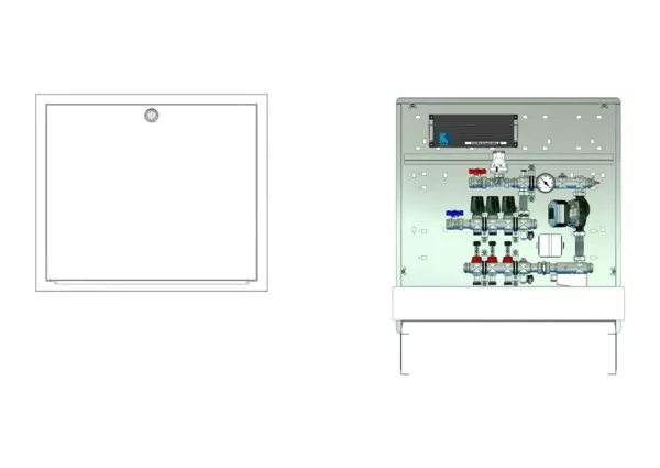 Die Regelstation für Flächenheizung ist mit einer Festwertregelung 20-50 °C ausgestattet. Die im Unterputzschrank montierte Regelgruppe umfasst eine Umwälzpumpe, einen Edelstahlverteiler mit regulierbaren Durchflussanzeigern und Ventileinsätzen (M30x1,5), sowie eine horizontale Anschlussgarnitur ohne Wärmezählerverrohrung. Die vormontierten und verdrahteten Stellantriebe sind auf einer montierten Klemmleiste installiert.