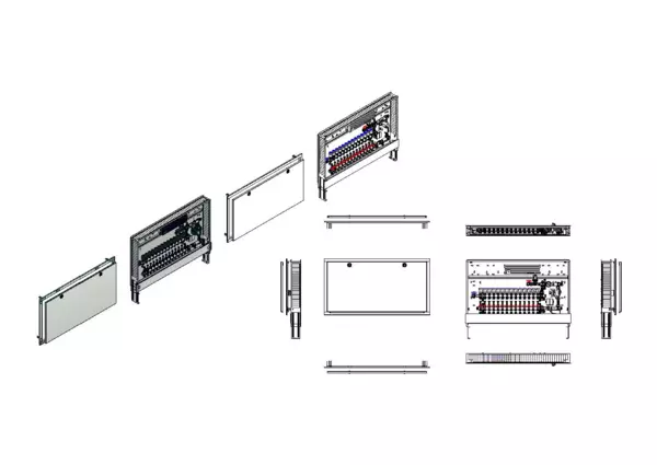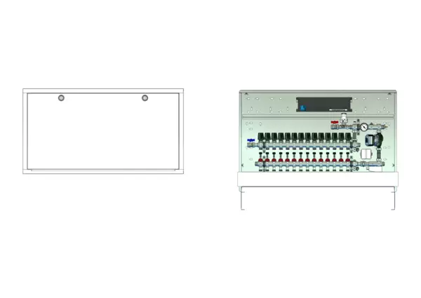 Die Regelstation für Flächenheizung ist mit einer Festwertregelung 20-50 °C ausgestattet. Die im Unterputzschrank montierte Regelgruppe umfasst eine Umwälzpumpe, einen Edelstahlverteiler mit regulierbaren Durchflussanzeigern und Ventileinsätzen (M30x1,5), sowie eine horizontale Anschlussgarnitur ohne Wärmezählerverrohrung. Die vormontierten und verdrahteten Stellantriebe sind auf einer montierten Klemmleiste installiert.
