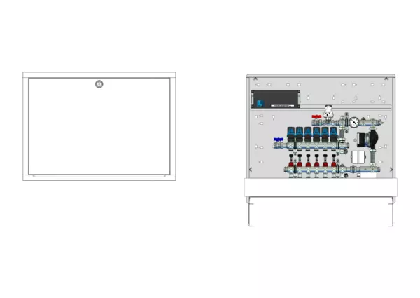 strawa Comfort Regelstation FBR-18-H-C69-EGO 6 Hkr.,BxHxT: 900 x 775 x 122 mm, Festwert 20-50°C mit Pumpe, horz. AG o. WMZ, Verteiler m. DFA min/max + THV für EGO, m. vorm. EGO-Regelantr. u. Klemml. m. Vorverdr., Comfort-UP-Schrank m. Frontbl. RAL 9016