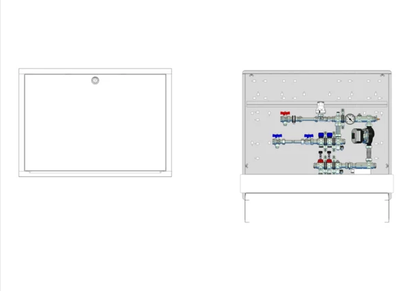 strawa Comfort Regelstation FBR-63-H-WMZ-C69 2 Hkr.,BxHxT: 900x775x122 mm, Festwert 20-50°C mit Pumpe, horz. AG m. WMZ, Verteiler mit DFA 0-3 l/min + THV M30x1,5, Comfort-UP-Schrank m. Frontbl. RAL 9016