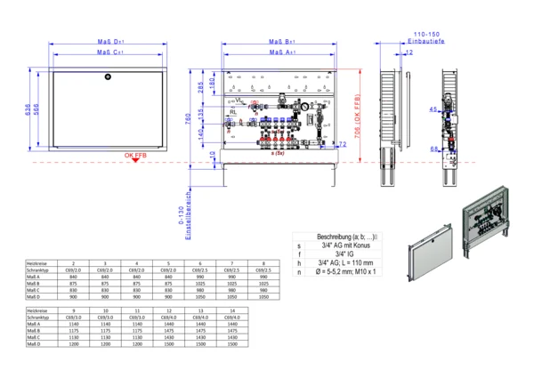 Die Regelstation für Flächenheizung ist mit einer Festwertregelung 20-50 °C ausgestattet. Die im Unterputzschrank montierte Regelgruppe umfasst eine Umwälzpumpe, einen Edelstahlverteiler mit regulierbaren Durchflussanzeigern und Ventileinsätzen (M30x1,5), sowie eine horizontale Anschlussgarnitur mit Wärmezählerverrohrung. Es gibt Platzhaltungen für Wasserzählereinbaustrecken, eine Klemmleiste und Stellantriebe.
