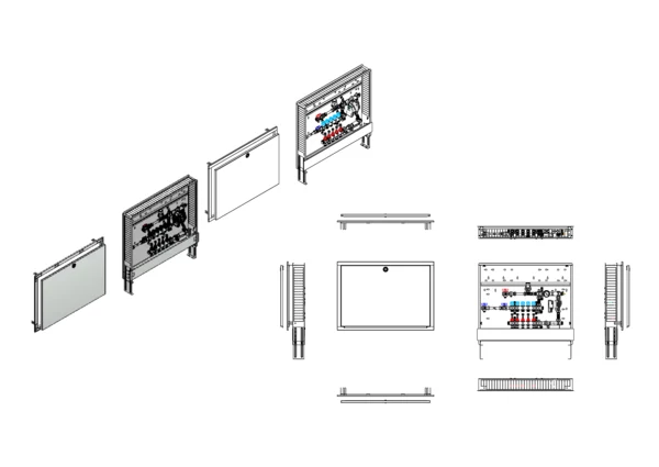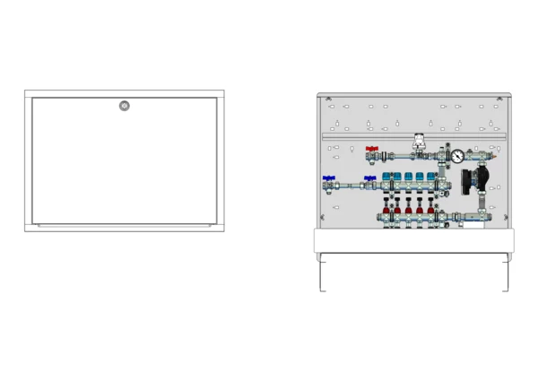 Die Regelstation für Flächenheizung ist mit einer Festwertregelung 20-50 °C ausgestattet. Die im Unterputzschrank montierte Regelgruppe umfasst eine Umwälzpumpe, einen Edelstahlverteiler mit absperrbaren Durchflussanzeigern und Ventileinsätzen für EGO-Schnellverschluss, sowie eine horizontale Anschlussgarnitur mit Wärmezählerverrohrung. Es gibt Platzhaltungen für Wasserzählereinbaustrecken, eine Klemmleiste und EGO-Regelantriebe.