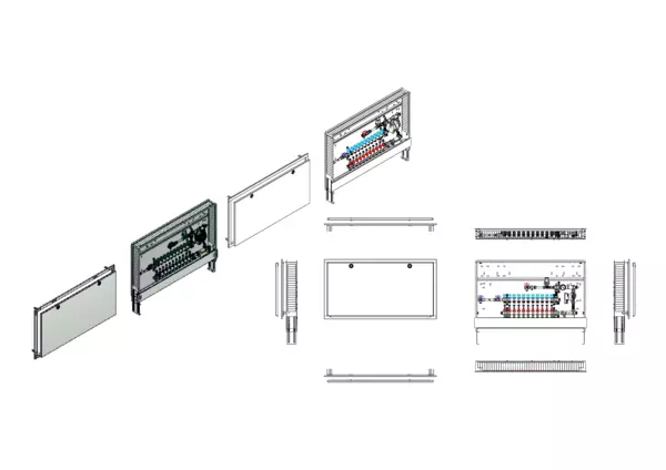 Festwertregelung 20-50 Grad Celsius mit Pumpe Wilo Para 15-130/6-43/SC-12, horizontale Anschlussgarnitur mit Wärmezählervorbereitung, Verteiler mit Durchflussanzeiger min/max im Vorlaufbalken und Thermostatventileinsatz für EGO-Aufnahme im Rücklaufbalken, Comfort-Unterputz-Schrank mit Frontblende RAL 9016