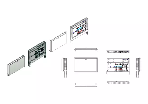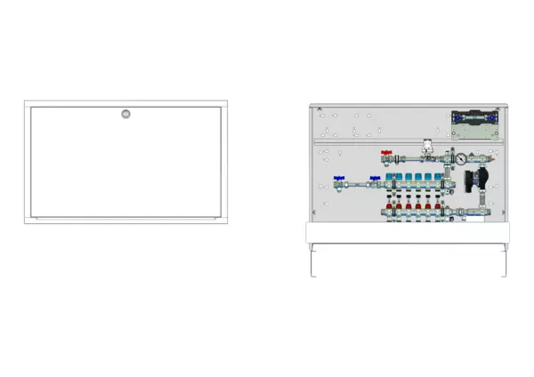 Die Regelstation für Flächenheizung ist mit einer Festwertregelung 20–50 °C ausgestattet. Die im Unterputz-Schrank montierte Regelgruppe umfasst eine Umwälzpumpe, einen Edelstahlverteiler mit absperrbaren Durchflussanzeigern und Ventileinsätzen für EGO-Schnellverschluss sowie eine horizontale Anschlussgarnitur mit Wärmezählerverrohrung. Zusätzlich ist eine Wasserzählereinbaustrecke für Trinkwasser kalt vorhanden, ebenso Platzhaltungen für eine Klemmleiste und EGO-Regelantriebe.