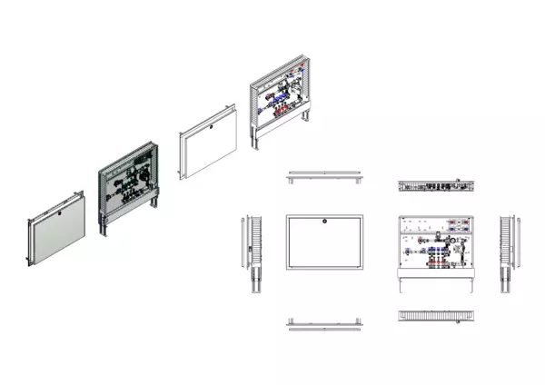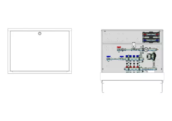 Die Regelstation für Flächenheizung ist mit einer Festwertregelung 20-50 °C ausgestattet. Die im Unterputzschrank montierte Regelgruppe umfasst eine Umwälzpumpe, einen Edelstahlverteiler mit regulierbaren Durchflussanzeigern und Ventileinsätzen (M30x1,5), sowie eine horizontale Anschlussgarnitur mit Wärmezählerverrohrung. Zusätzlich sind Wasserzählereinbaustrecken für Trinkwasser kalt und warm vorhanden. Es gibt Platzhaltungen für eine Klemmleiste und Stellantriebe.