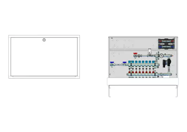strawa Comfort Regelstation FBR-18-H-W2-WMZ-C69 8 Hkr.,BxHxT: 1050x775x122 mm, Festwert 20-50°C mit Pumpe, horz. AG m. WMZ, Verteiler m. DFA min/max + THV für EGO, Wasserzählerstr. TW kalt u. warm, Comfort-UP-Schrank m. Frontbl. RAL 9016