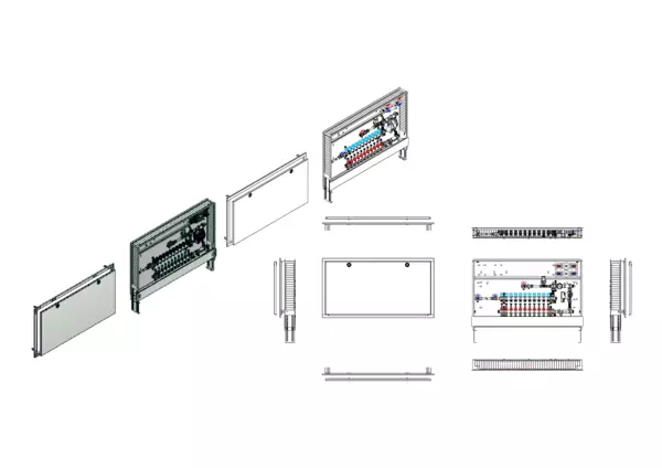 Festwertregelung 20-50 Grad Celsius mit Pumpe Wilo Para 15-130/6-43/SC-12, horizontale Anschlussgarnitur mit Wärmezählervorbereitung, Verteiler mit Durchflussanzeiger min/max im Vorlaufbalken und Thermostatventileinsatz für EGO-Aufnahme im Rücklaufbalken, Wasserzählerstrecken Trinkwasser kalt und warm, Comfort-Unterputz-Schrank mit Frontblende RAL 9016