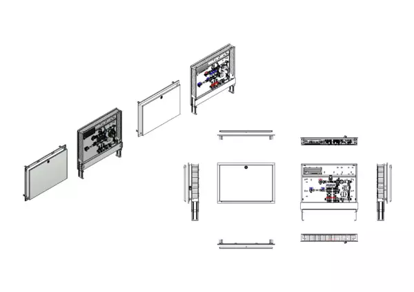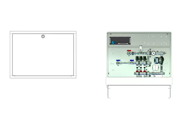 Die Regelstation für Flächenheizung ist mit einer Festwertregelung 20-50 °C ausgestattet. Die im Unterputzschrank montierte Regelgruppe umfasst eine Umwälzpumpe, einen Edelstahlverteiler mit regulierbaren Durchflussanzeigern und Ventileinsätzen (M30x1,5), sowie eine horizontale Anschlussgarnitur mit Wärmezählerverrohrung. Die vormontierten und verdrahteten Stellantriebe sind auf einer montierten Klemmleiste installiert. Es gibt Platzhaltungen für Wasserzählereinbaustrecken.